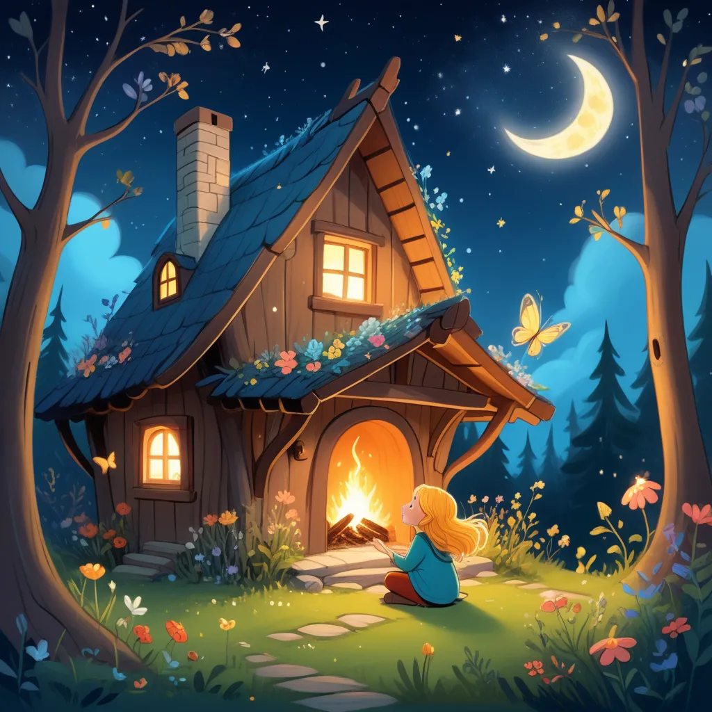 On a quiet, starry night, inside a cozy little cabin nestled at the edge of an enchanted forest, there sat a kind-hearted woman by her fireplace. Her small, cluttered room was filled with mysterious and fascinating things: jars of sparkling fairy dust, books with golden spines, and a tiny, intricately carved wooden wishing well. The gentle glow of the fire flickered warmly across the room, casting dancing shadows on the walls.