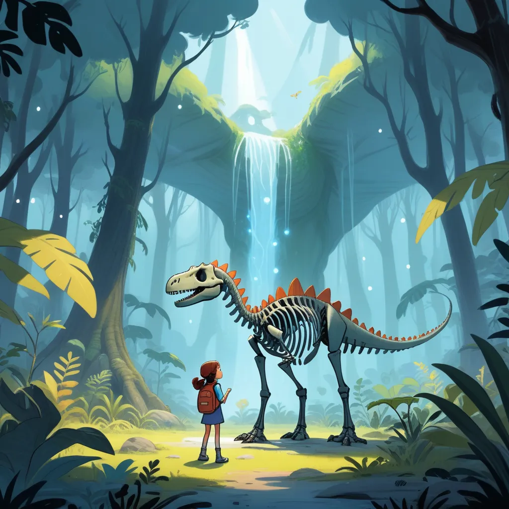 The Titanosaurus’ skeleton shifted slightly, and from the shadows stepped a tiny, glowing, friendly spirit of the Titanosaurus. "Ah, a brave little explorer! Would you like to go on an adventure?" The ghostly dinosaur's eyes twinkled warmly.