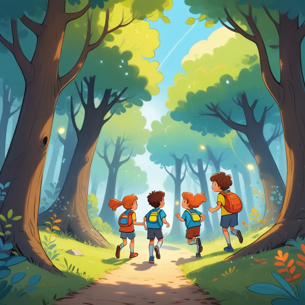 Mia grabbed her friend Leo, an adventurous boy with a wild head of curly hair, and the two sped off to the Whispering Woods, their backpacks bouncing against their backs. The woods themselves were a mix of cozy yet slightly eerie, with tall ancient trees and winding paths that seemed to whisper secrets to those who could listen.