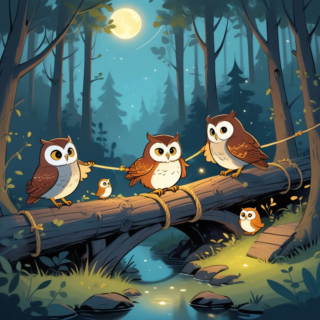In a cozy forest clearing, where fireflies danced and crickets sang their nightly lullabies, lay the small wooden cabin of Otto the Owl. Otto was a wise and kind bird, with his home filled with intriguing trinkets and old books. The air was cool and crisp, with a hint of mystery that always seemed to promise an adventure. Tonight, the full moon cast a silvery glow on the enchanted woods, making everything appear magical.