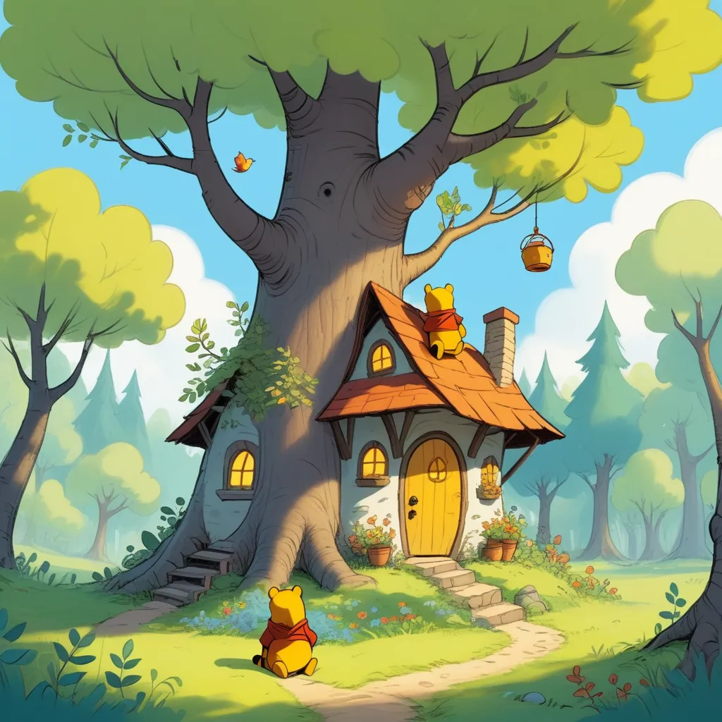 In the middle of a great green forest, there stood a cozy little house with a sign that read "Mr. Sanders" above the door. Inside lived a round, chubby bear named Winnie-the-Pooh. You see, Pooh was a bear of very little brain but a heart full of curiosity and bravery.