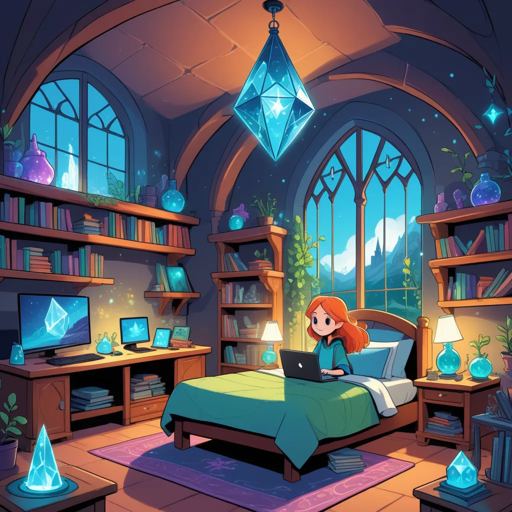"Now, let's test our creation!" Master Bill declared. He conjured a spell that transported the Xbox to a child's cozy bedroom. The room had posters of dragons, knights, and spaceships on the walls. The bed was shaped like a pirate ship, and stuffed animals were strewn around, all watching in curiosity.