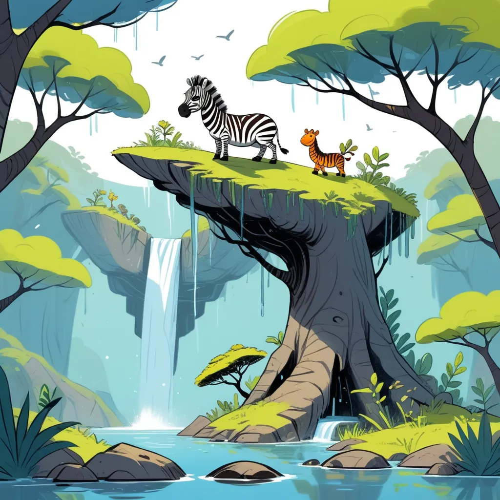 In a quiet corner of the African savannah, where the tall grasses whispered secrets to each other and the trees stood as ancient sentinels, lived a young zebra named Zuri. Zuri’s home was a cozy, slightly eerie patch of land under a vast Acacia tree. The evening sun cast long shadows, making the surroundings look magical and a bit mysterious.